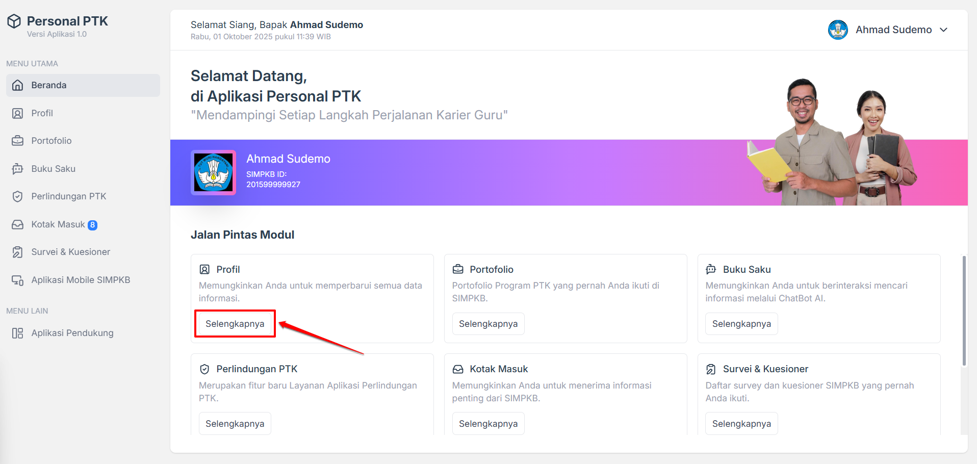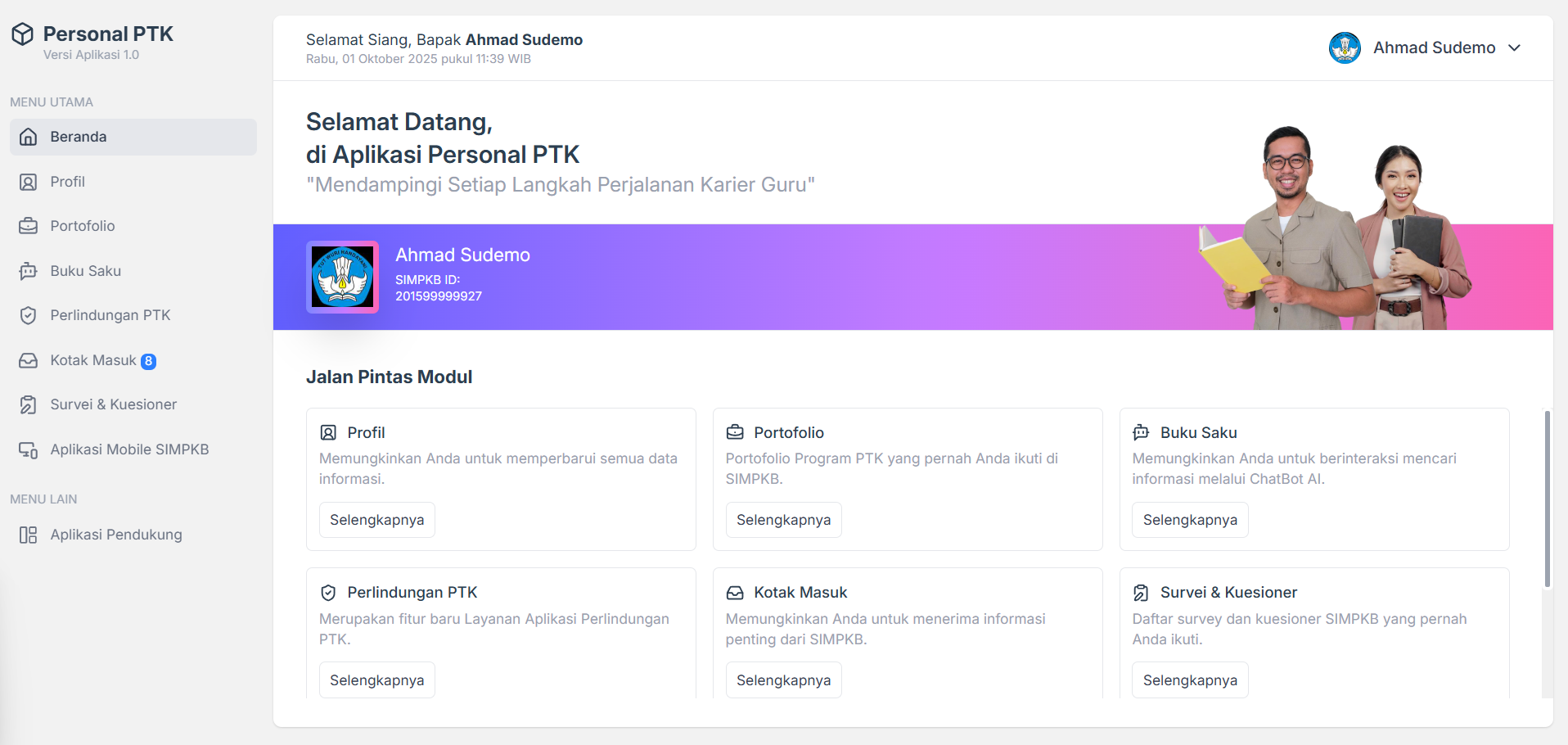 Sistem akan mengarahkan Anda pada laman Dasbor Personal Akun SIMPKB Anda.