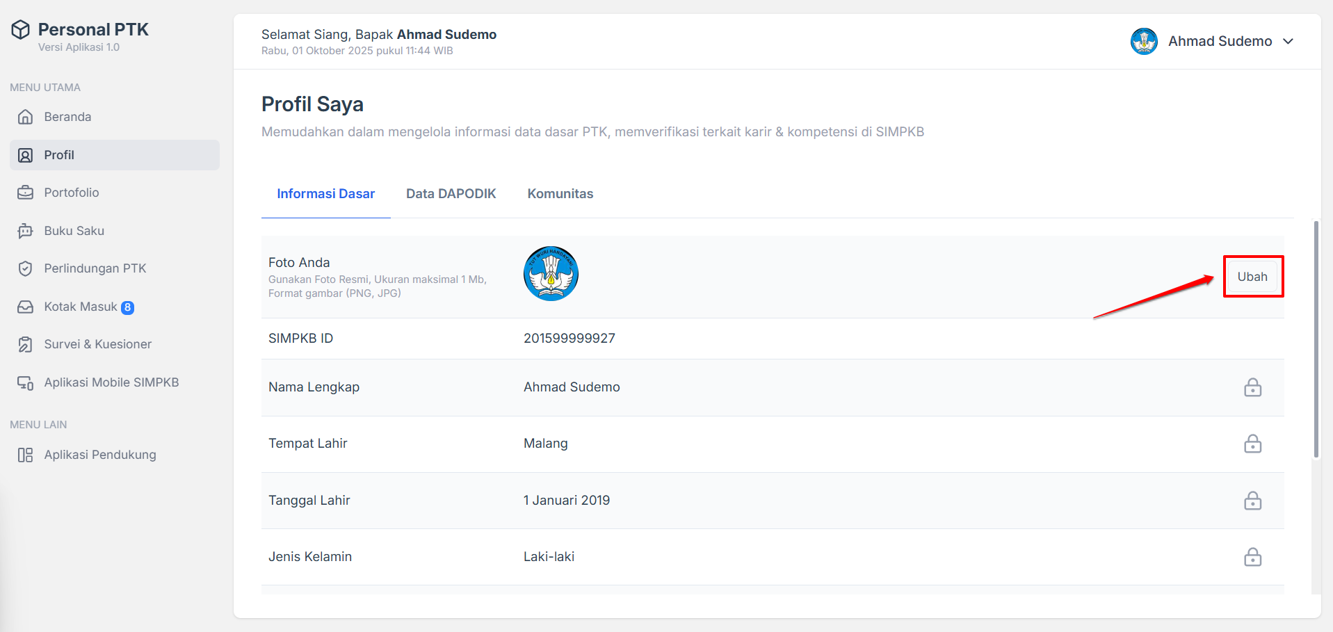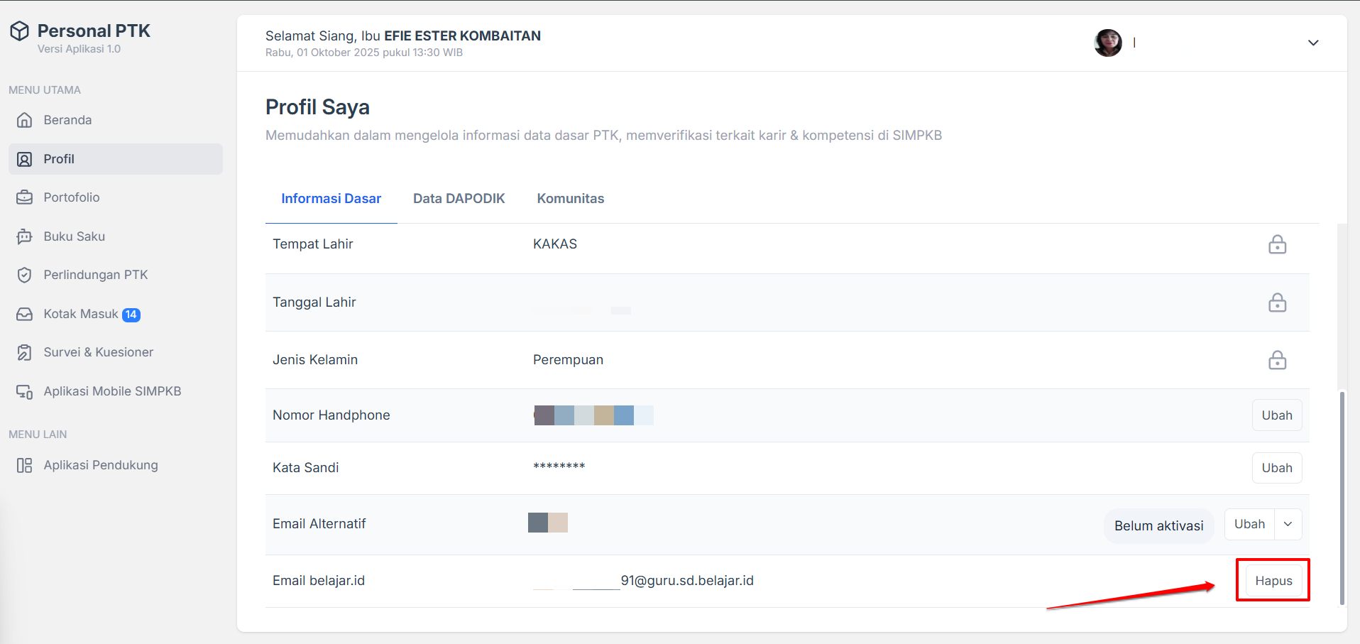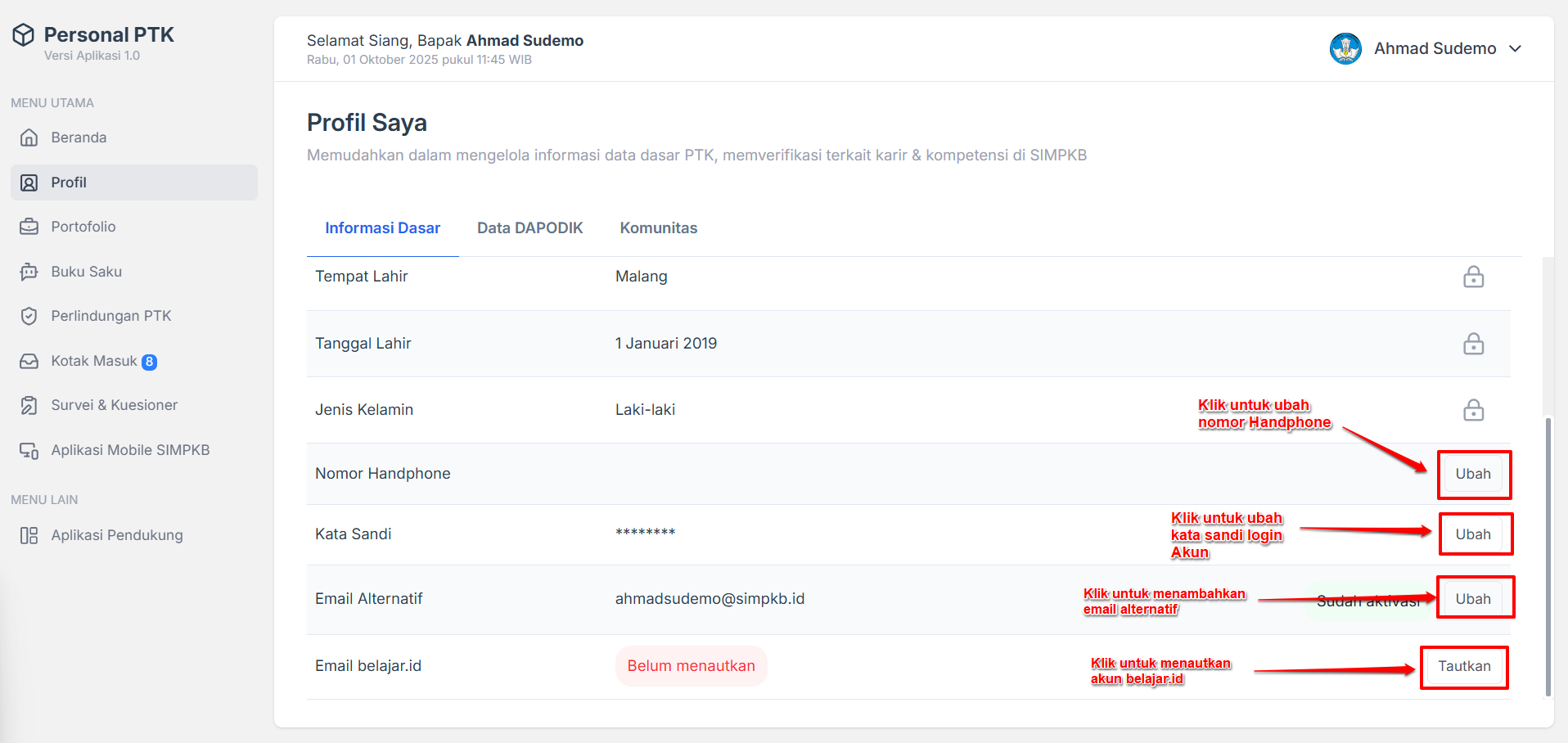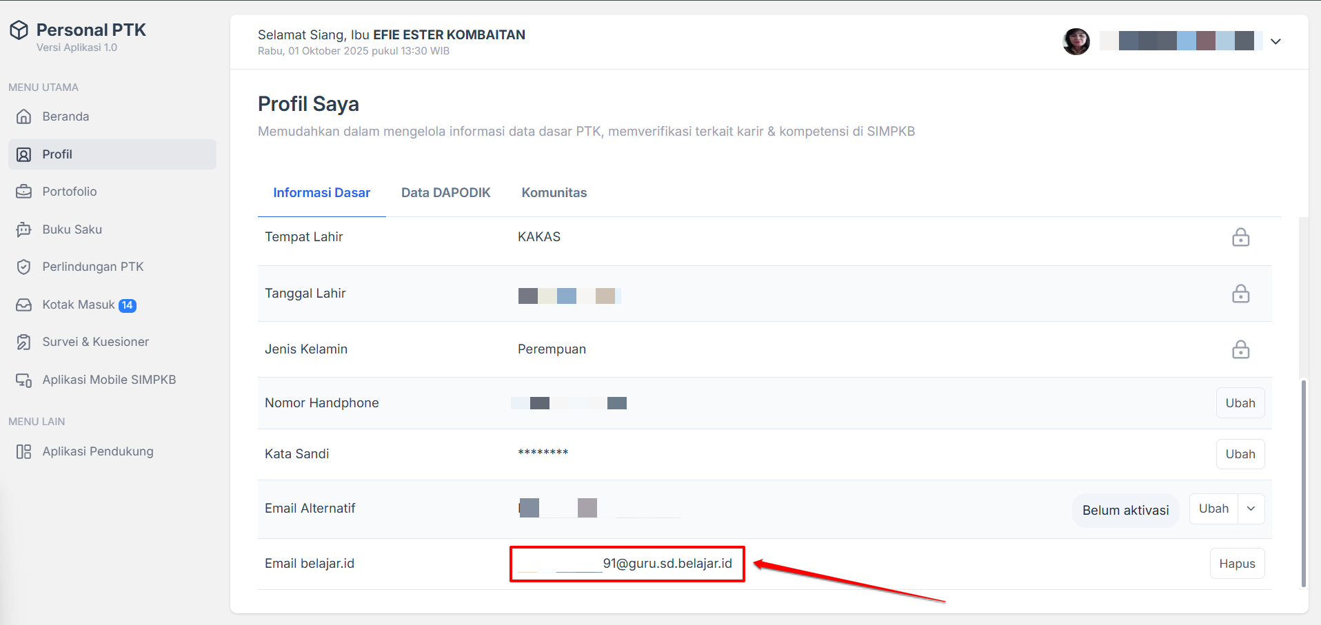 Akan ditampilkan data personal Anda yang juga bersumber dari data Dapodik.