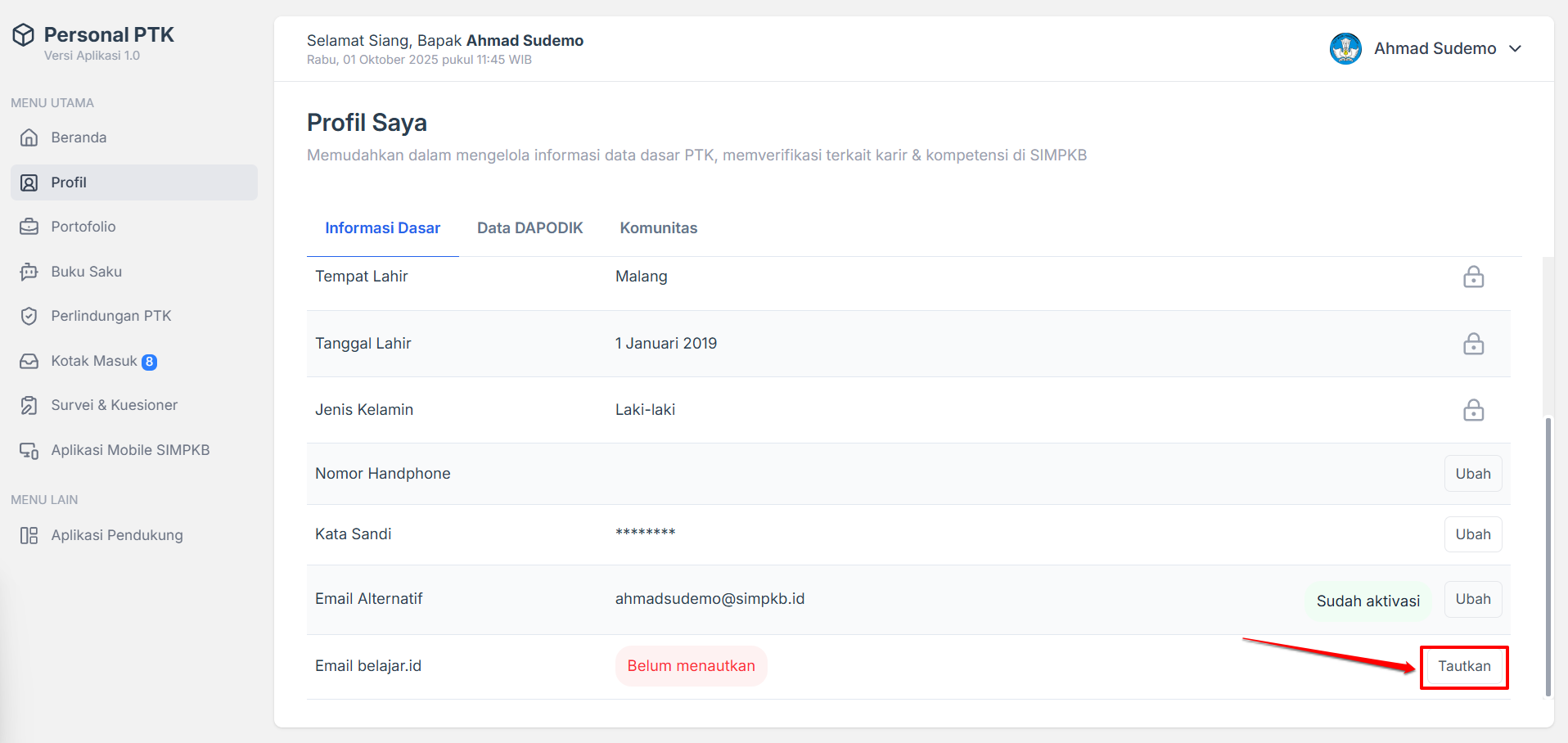 Berikut langkah singkat menautkan akun pembelajaran (https://belajar.id/) di SIMPKB :